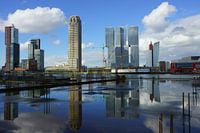 Foto van diverse gebouwen op de Kop van Zuid in Rotterdam, weerspiegeld in plassen op een bouwplaats aan de Rijnhaven op Katendrecht. De rode bakstenen van de Rechtbank Rotterdam kleuren mooi bij de roestige wapening in de fundering op de voorgrond.