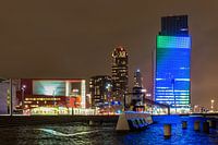Vanuit centrum Rotterdam richting kop van Zuid is een prachtig kruispunt op het Wilhelminaplein. Kleuren komen goed zoals is dit werk. Vocht in de lucht poppen de kleuren op met een licht waas door het vocht in de lucht.