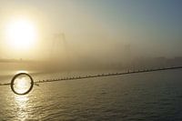 Willemsbrug over de Maas in Rotterdam in de mist. De zon schijnt door de nevel en belicht het Maasbeeld. Op dat grote kunstwerk zitten meeuwen mooi op een rij.