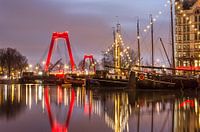Een sfeervol plaatje, gemaakt op een bijna windstille ochtend bij de Oude Haven in Rotterdam, met de rode pylonen van de Willemsbrug, historische binnenvaartschepen en het beroemde Witte Huis, in 1898 de eerste wolkenkrabber van Europa.