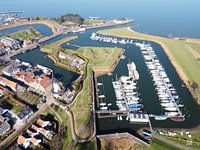 Willemstad in Nederland met de moderne haven waar zeiljachten en motor jachten liggen voor pleziervaart en vrijetijd. Europese vesting stad met geschiedenis en populair bij toerisme. met in centrum de traditionele houten molen.