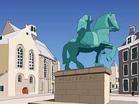 Onder een stralend blauwe, wolkeloze lucht staat het gestileerde beeld van Willibrord centraal in dit digitale kunstwerk. De figuur is gezeten op een krachtig paard, beide weergegeven in strakke, vereenvoudigde lijnen en vlakken, met een subtiele metaalachtige glans die het moderne karakter van het beeld benadrukt. Willibrord houdt een schaalmodel van een kerk omhoog, symbool voor zijn missionaire werk, terwijl het paard trots en energiek lijkt te bewegen, alsof het net tot stilstand is gekomen.