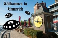 Emmerich am Rhein, (Emmerik) Noordrijn-Westfalen, GermanyRheinpromenade. Pegeluhr, Huge Stream gauge on the quayside.The River Rhine is visibly lower than normal due to the 2018 summer drought conditions. Willkommen in Emmerich - Welcome to Emmerich