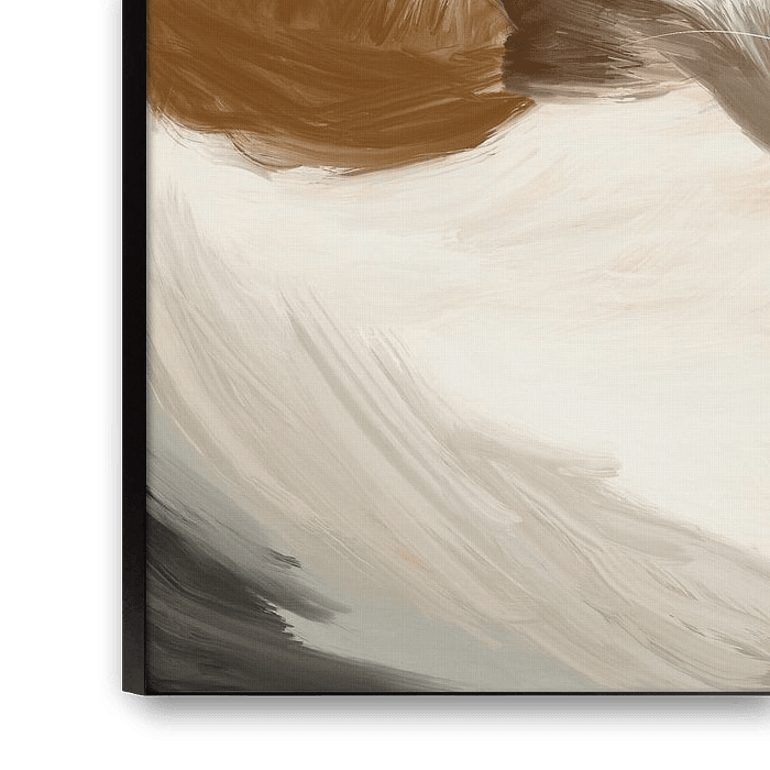 Een kat die heerlijk ligt te slapen, rustiger dan dit wordt het niet. In dit schilderij draait alles om zachtheid: de warme bruintinten, het romige wit en die zachte penseelstreken die bijna lijken te bewegen. Je voelt gewoon de warmte van het dier en de stilte van het moment. De losse, schilderachtige stijl geeft het geheel iets dromerigs en moderns tegelijk, alsof je stiekem even meekijkt in een klein, intiem moment van rust. Dit werk brengt meteen sfeer in huis, ideaal voor in de woonkamer, slaapkamer of een knusse leeshoek. Ook op kantoor of in een hotelkamer zorgt het voor een ontspannen, huiselijk gevoel. Het is een schilderij dat je elke keer weer even laat glimlachen en tot rust komen. Perfect voor kattenliefhebbers of iedereen die houdt van die kalme, zachte momenten waar de wereld even stilstaat.