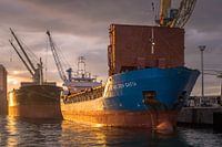 Vrachtschip Wilson Gaeta in het gouden avondzonnetje aan het lossen in A Coruna, Spanje. 2 Mannen hangen over de rand van het ruim om de werkzaamheden in de gaten te houden. Erachter ligt bulkcarrier Star Zeta.