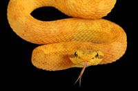 Een portret van een Wimpergroefkopadder. Deze gifslangen zijn er in veel kleurvariaties. Dit felgeel exemplaar is werkelijk schitterend.