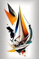 Het abstracte schilderij toont een zeilboot in volle vaart op volle zee. De boot is gestileerd en geabstraheerd weergegeven, met dynamische, gebogen lijnen en sterke kleuren die de indruk van wind en beweging versterken. De vorm van de boot wordt slechts gehint, zodat de nadruk ligt op de beweging en energie die de boot creëert. De golven en de lucht zijn weergegeven in snelle, expressieve penseelstreken, die de dynamiek van het schilderij versterken. Over het geheel genomen is "Wind en golf" een krachtig en energiek schilderij dat de kijker meeneemt naar een wereld van snelheid en avontuur.