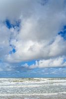 Golven naderen de Hollandse kust en de wind veroorzaakt veel schuim aan de kust. Grote witte wolken drijven dreigend over de zee. Foto gemaakt op het waddeneiland Texel.