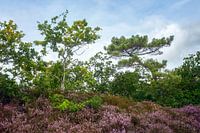 Een glooiende duinheuvel begroeid met paarse heide en grillig gevormde bomen. Het paars contrasteert met het frisse groen en de licht bewolkte lucht, waardoor een verstild moment in het Nederlandse duinlandschap ontstaat, waar wind en natuur vrij spel hebben.