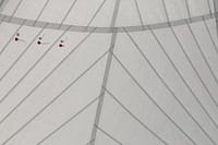 Een close-up van de zeilen van een zeilboot. Het materiaal blijft onder alle weersomstandigheden goed.