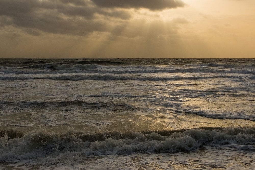 Een stevige voorjaarswind, voorbij vliegende wolken en een levendige zee zorgen voor een mooi plaatje aan de kust van Vlissingen, Zeeland. Foto gemaakt in de namiddag.