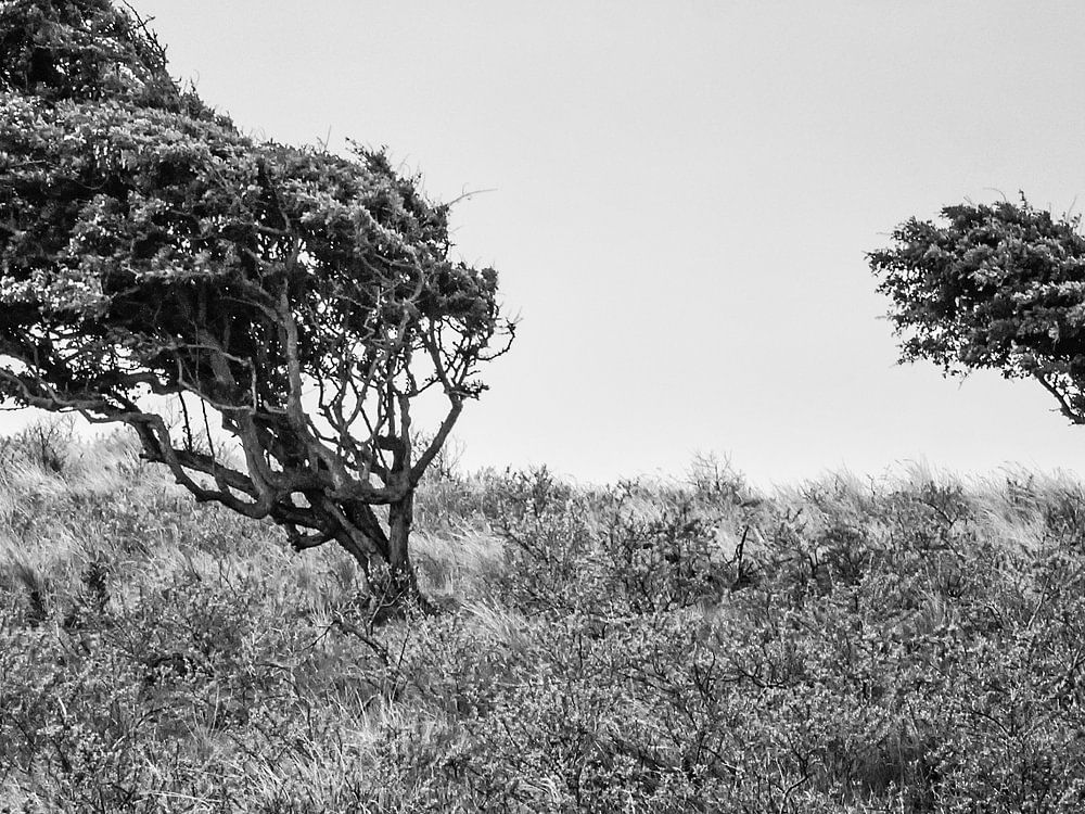 In het duinlandschap van Noord-Holland buigen meidoornstruiken mee met de wind. Zwart-wit shot.