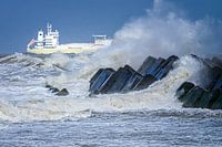 Terwijl op de voorgrond de hevige golven tegen de betonnen zeewering stoten, vaart op de achtergrond een zeeschip de haven van Rotterdam in.