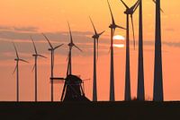 Molen 'De Goliath' en moderne windturbines tijdens een kleurrijke zonsondergang in de buurt van de Eemshaven in de provincie Groningen.