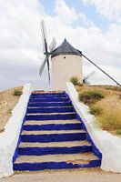 Traditionele historische Spaanse molen van Don Quichote (Quixote, Quijote) onder een mooie wolkenlucht, Consuegra, Castilla la Mancha, Spanje. De avontuurlijke verhalen van Don Quichot zijn geschreven door schrijver Cervantes.