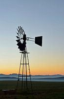 Landschap met een windturbine waterpomp en de Ceres Mountains bij zonsopgang