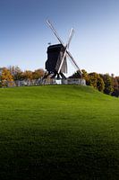 Boven op een zachte, groene heuvel staat een traditionele windmolen die sierlijk afsteekt tegen de uitgestrekte blauwe lucht. De lange wieken reiken naar buiten alsof ze de wind omarmen, terwijl het donkere houten bouwwerk prachtig contrasteert met het heldere landschap. Vanuit het weelderige gras dat zich over de voorgrond uitstrekt,…