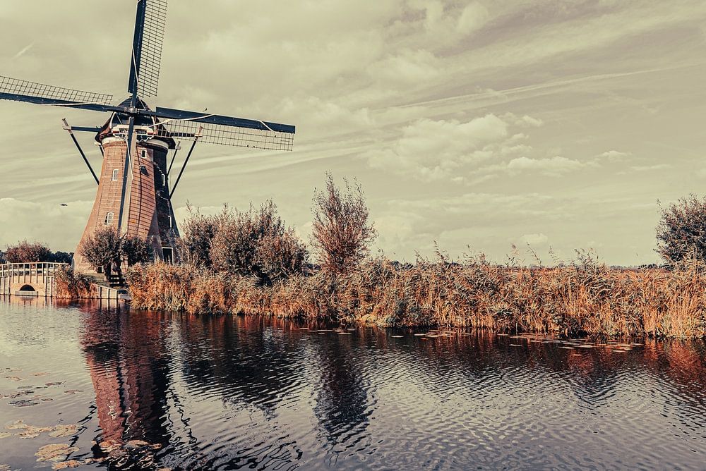 Sepia windmolen aan het water in een oude uitstraling bewerkt .