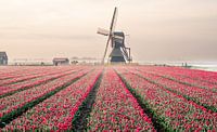Windmolen achter een tulpenveld tijdens een mistige ochtend in Noord-Holland.