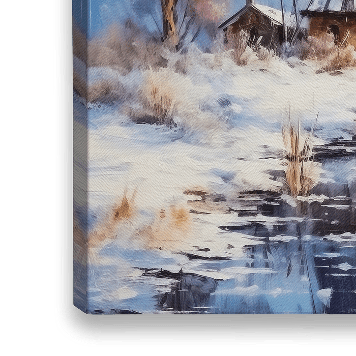 Dit kunstwerk vangt een winterlandschap in sublieme rust, waarin een oude molen, kenmerkend voor het Nederlandse landschap, het middelpunt vormt. De donkere wieken steken duidelijk af tegen de delicate lucht op de achtergrond, terwijl de opkomende zon het landschap in pastelkleuren baadt. Het spiegelende water op de voorgrond werkt als…
