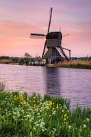 Windmolen en bloemen bij zonsondergang, Kinderdijk, Nederland