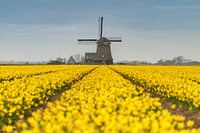 Een narcissenveld met in de achtergrond een molen tijdens de zonsondergang. Noord-Holland staat in het voorjaar in bloei.
