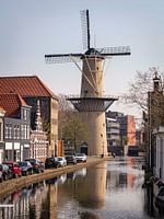 Stadsgezicht van de gracht met windmolen in de historische binnenstad van Schiedam (Zuid-Holland, Nederland).