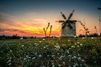 Windmolen in de zonsondergang Tez Unagrn met bloemen van Fotos by Jan Wehnert