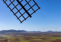 De verhalen van Don Quijote zijn bekend; de ridder die tegen de windmolens vocht. Deze windmolens staan in centraal Spanje op de Meseta op een aantal verschillende plaatsen. Hier zien we door een wiek, het uitzicht op het landschap rondom de plaats Consuegra.