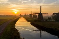 Nederlands landschap, windmolens in het vroege ochtendlicht. De laag hangende mist zorgt voor een mooi diffuus licht.