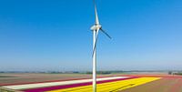 Windturbine en een tulpenveld in Flevoland, Nederland, in het voorjaar van bovenaf gezien. Flevoland is een provincie van polders in de voormalige Zuiderzee, oorspronkelijk bedoeld om meer land voor de landbouw te creëren.
