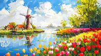 Windmolen en kleurrijke tulpen op een heldere zonnige dag met blauwe lucht. Schilderachtig landschap van een prachtig Nederlands platteland met groene weiden op de achtergrond, weerspiegeling van bloemen op het wateroppervlak, levendige kleuren in een schilderachtig landschap.