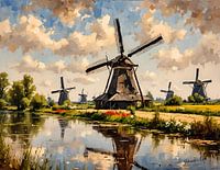 Een sereen landschap met verschillende traditionele windmolens onder een dynamische wolkenlucht, die weerspiegelt op het kalme water eronder. De waterkant is versierd met weelderig groen en een plons van kleurrijke bloemen, die de pittoreske kwaliteit van het tafereel versterken.