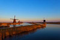 Zonsondergang aan de Kinderdijk met de vele windmolens in het laatste licht met mooie kleuren aan de hemel.