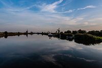 Windmolens aan de Kinderdijk gefotografeerd bij de ondergaande zon met avondkleuren in de lucht.