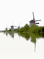Het beroemde molenensemble wordt weerspiegeld in het water van de Kinderdijkse gracht in Nederland. Een digitaal schilderij in aquarelstijl.
