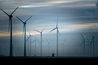 Windmolens van de Eemshaven in de mist. Contrast tussen oude poldermolen Goliath en de nieuwe turbines.