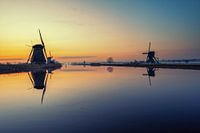 Zonsopkomst bij de windmolens van Kinderdijk met een spiegeling in het water.