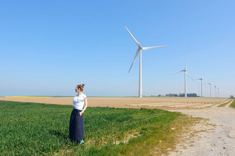 Koop de foto Windmolens in het veld en een vrouw van Anastasiia Chervinska op canvas, aluminium dibond, (ingelijste) fotoprint, behang en ArtFrame, op maat geprint in Fine-Art kwaliteit.