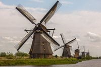 Een typisch Nederland landschap. Molens langs het water op de Kinderdijk met een blauwe lucht een Hollandse wolken.