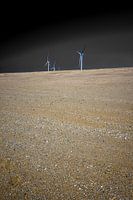 Windmolens op het strand van de Maasvlakte. Gefotografeerd vanaf een laag standpunt, geeft dit een bijzonder beeld. De windmolens ogen klein, maar blijven de aandacht trekken. Dit word nog eens versterkt door de kleur uit de lucht te halen.