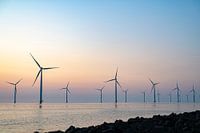 Windturbines die duurzame hernieuwbare energie produceren in een offshore windpark in het IJsselmeer voor de kust van Flevoland tijdens zonsondergang.
