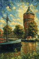 Langs de schilderachtige Wilhelminakade in Groningen ligt de boot Windroos vredig aangemeerd, omgeven door kabbelend water, zomerse luchten en een weelderige groenstrook vol brandnetels en fluitenkruid. Het is een scène die haast verstild lijkt — alsof de tijd hier even pauze heeft genomen. Op de achtergrond rijst de monumentale oude watertoren op, ooit een industrieel baken van waterdruk en vooruitgang, nu een luxueus hotel met uitzicht over stad en kanaal.