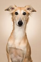 Portret van een silken windsprite een langharige whippet tegen een ton-sur-ton creme achtergrond