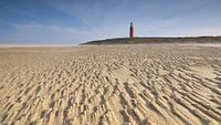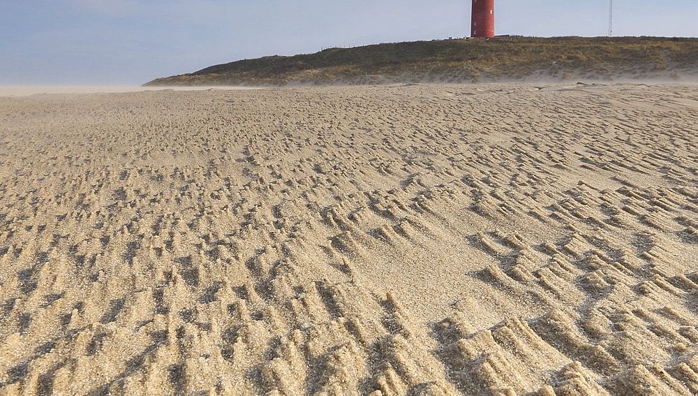 De wind heeft zijn sporen nagelaten in het zand van Texel en vormt een natuurlijk patroon dat rust en beweging tegelijk uitstraalt. Op de achtergrond rijst de iconische rode vuurtoren van Texel op, een herkenbaar symbool van het eiland en de Nederlandse kust. De combinatie van zachte zandkleuren, een helderblauwe lucht en het krachtige…