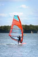 Een foto van een windsurfer die zijn sport aan het beoefenen is. Kleurrijk t.o.v de omgeving en mooi centraal in beeld waardoor hij de aandacht trekt. Een foto om op te hangen bij liefhebbers van deze sport of in een windsurf club.