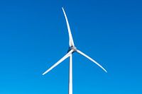 Windturbines die duurzame hernieuwbare energie produceren tijdens een zonnige dag met een strakblauwe lucht op de achtergrond.