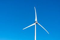 Windturbines die duurzame hernieuwbare energie produceren tijdens een zonnige dag met een strakblauwe lucht op de achtergrond.