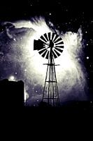 Close-up van een waterpomp windmolen met nachtelijke hemel monochroom mixed media
