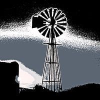 Close-up van een waterpomp windmolen met nachtelijke hemel monochroom mixed media